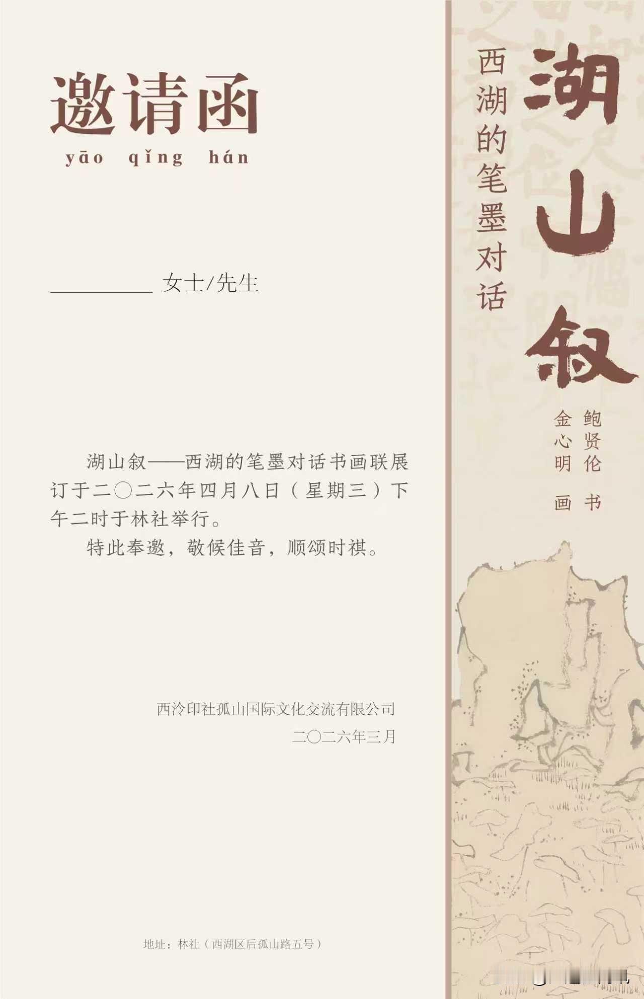 此展由西泠印社孤山國際文化交流有限公司、西湖畫會主辦,杭州林社文化藝術發展有限公司承辦,並得到西湖風景名勝區岳廟管理處、中國郵政集團杭州市分公司、西泠印社出版社、寒之友社、楓橋書畫院等單位支持;共展出當代書法家鮑賢倫、金石書畫家金心明新近創作的100余件尺牘書畫精品。