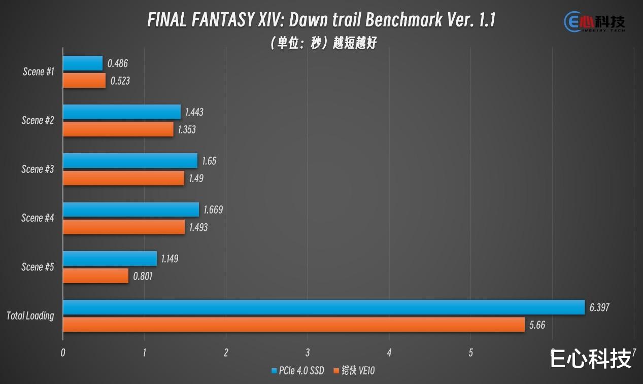 《FF XIV:Dawntrail》官方基准测试工具,可精准记录游戏内5个典型场景的加载耗时。哪怕满速PCIe 4.0 SSD已经能完全满足游戏的存储需求,铠侠VE10的加载速度依旧能再上一层楼。