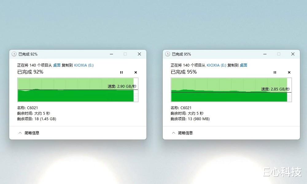 本次对比的两款产品,上图为本次体验的PCIe 5.0规格铠侠VE10 SSD,下图为某款PCIe 4.0满速NVMe SSD。结果一目了然:无论是游戏场景下的有效带宽表现,还是安装、加载的耗时,VE10都全面占优。这也直观体现出,同样的“满血”SSD,PCIe 5.0款对比前代产品呈现出“降维打击”的性能优势。