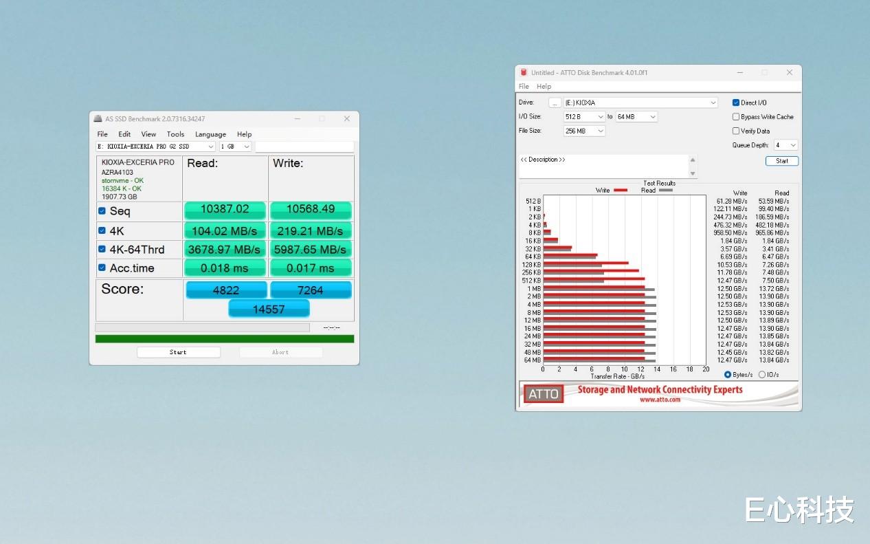 而在更贴近日常真实存储场景的测试软件AS SSD Benchmark中,铠侠VE10最终拿下14557的超高总分。在主打全文件规格读写测试的ATTO Disk Benchmark中,VE10的最高读写性能同样表现出色。