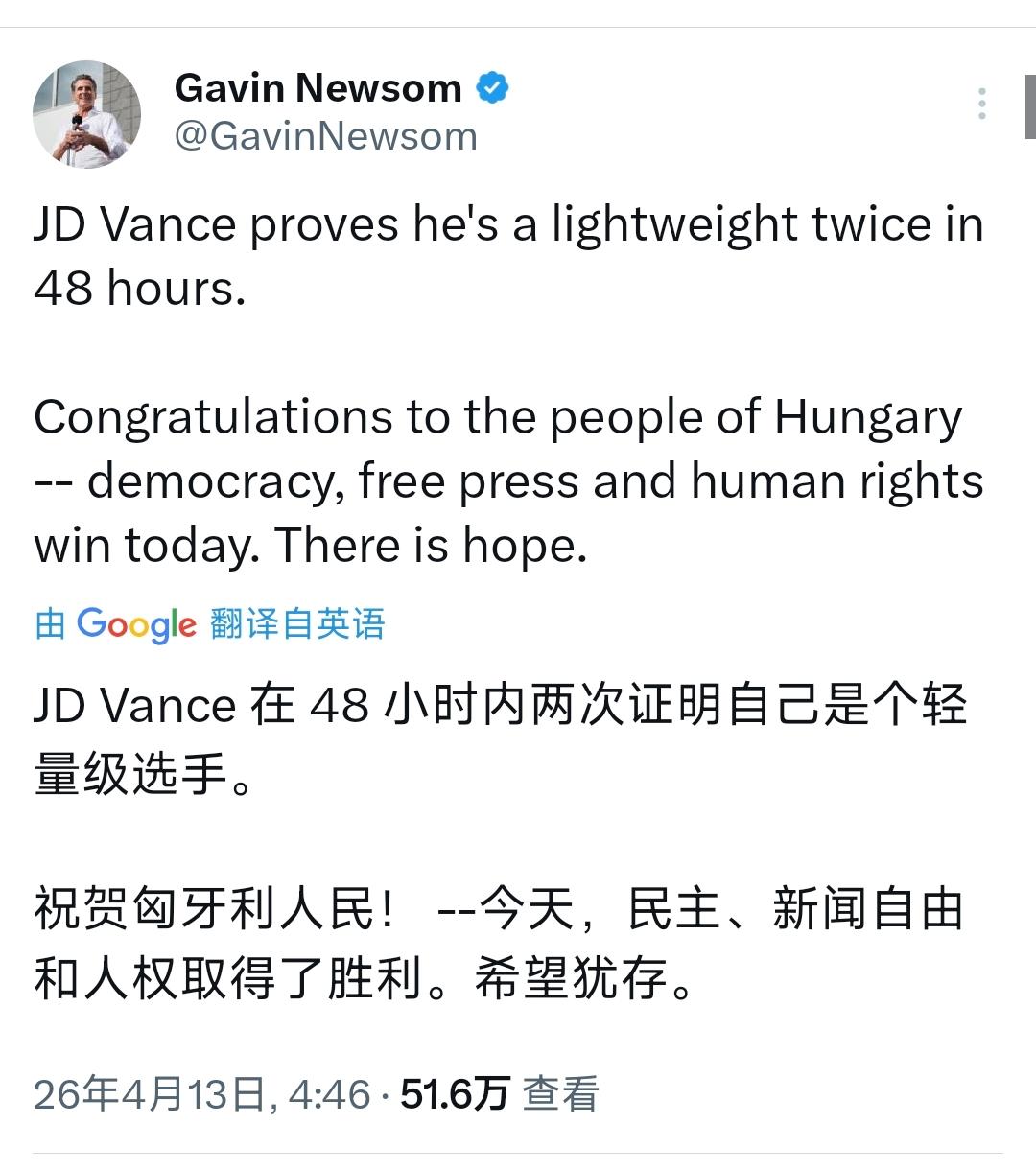 加州州长纽森北京时间4月13日写道:“JD·万斯在 48 小时内两次证明自己是个无足轻重的人物。向匈牙利人民表示祝贺——民主、自由媒体和人权在今天取得了胜利。希望犹存。”