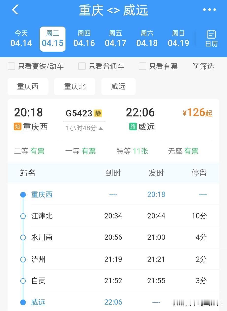 首先是重庆西开往威远的G5423/2次高铁列车,全程途经江津北,永川南,泸州站,自贡站,其中重庆段停靠两个站,四川段停靠两个站,仅停靠沿线的4个大站,1小时48分到达威远,全程票价126元。