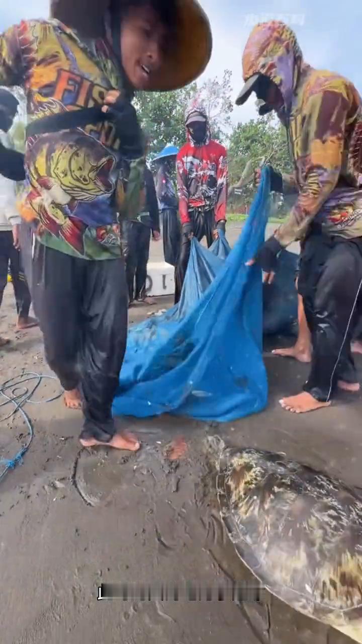 本以为渔民们准备把大海龟带回家,起锅烧油,哪知这时另一个渔民走过来帮忙,一把按住了大海龟。这时渔民小哥也解释起来,原来他并不想伤害大海龟,而是想帮助他。