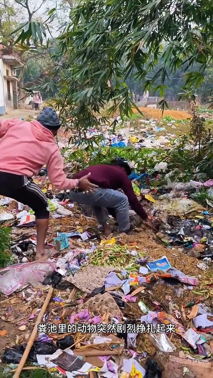 注意看,男人正挑着一根绳子试图套住粪池里的动物,哪知男人却没能成功。眼看时间一点点过去,他索性咬牙走进粪池边缘,不顾脏臭与疲惫,直接伸出手把绳子往动物头上套。