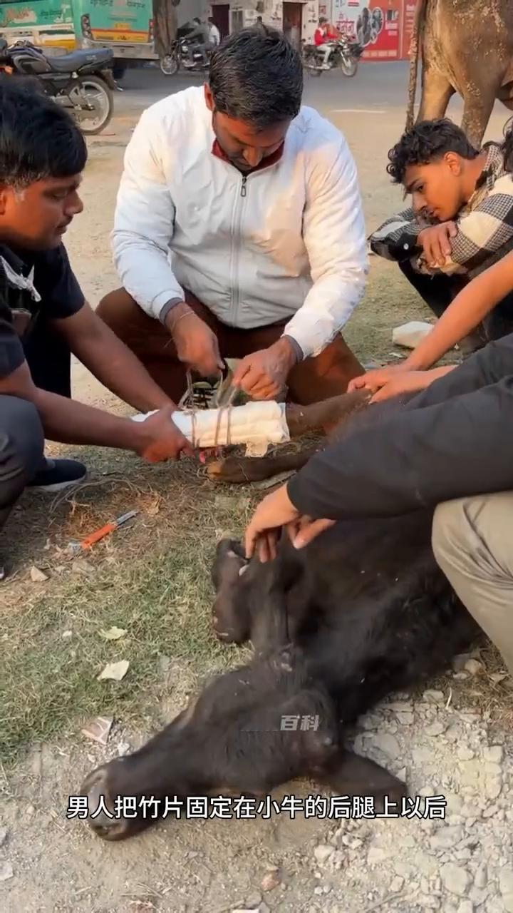 只见男人首先拿来竹片,然后熟练的在上面包上棉絮,接着又用棉絮包裹住小牛犊的后腿。原来男人是当地动物救助站的工作人员,他看到小牛犊如此可怜才决定伸出援手对它展开救助。就这样男人把竹片固定在小牛的后腿上以后又用纱布进行了一系列的包扎。