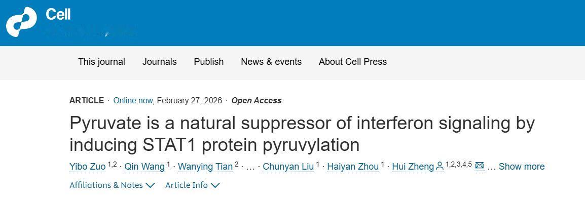 2月27日,电子科技大学登顶《Cell》,发表《丙酮酸通过诱导STAT1蛋白的丙酮酸化,成为干扰素信号传导的天然抑制剂》研究成果。