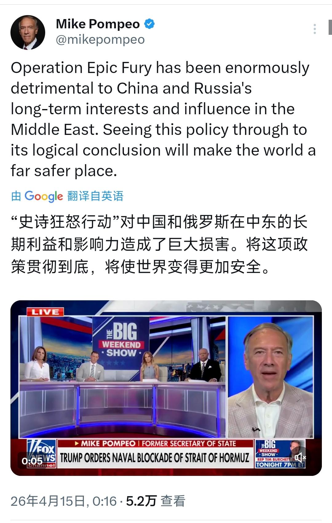 越来越瘦的美国前国务卿蓬佩奥北京时间4月15日写道:“‘史诗狂怒行动’对中国和俄罗斯在中东的长期利益和影响力造成了巨大损害。将这项政策贯彻到底,将使世界变得更加安全。”