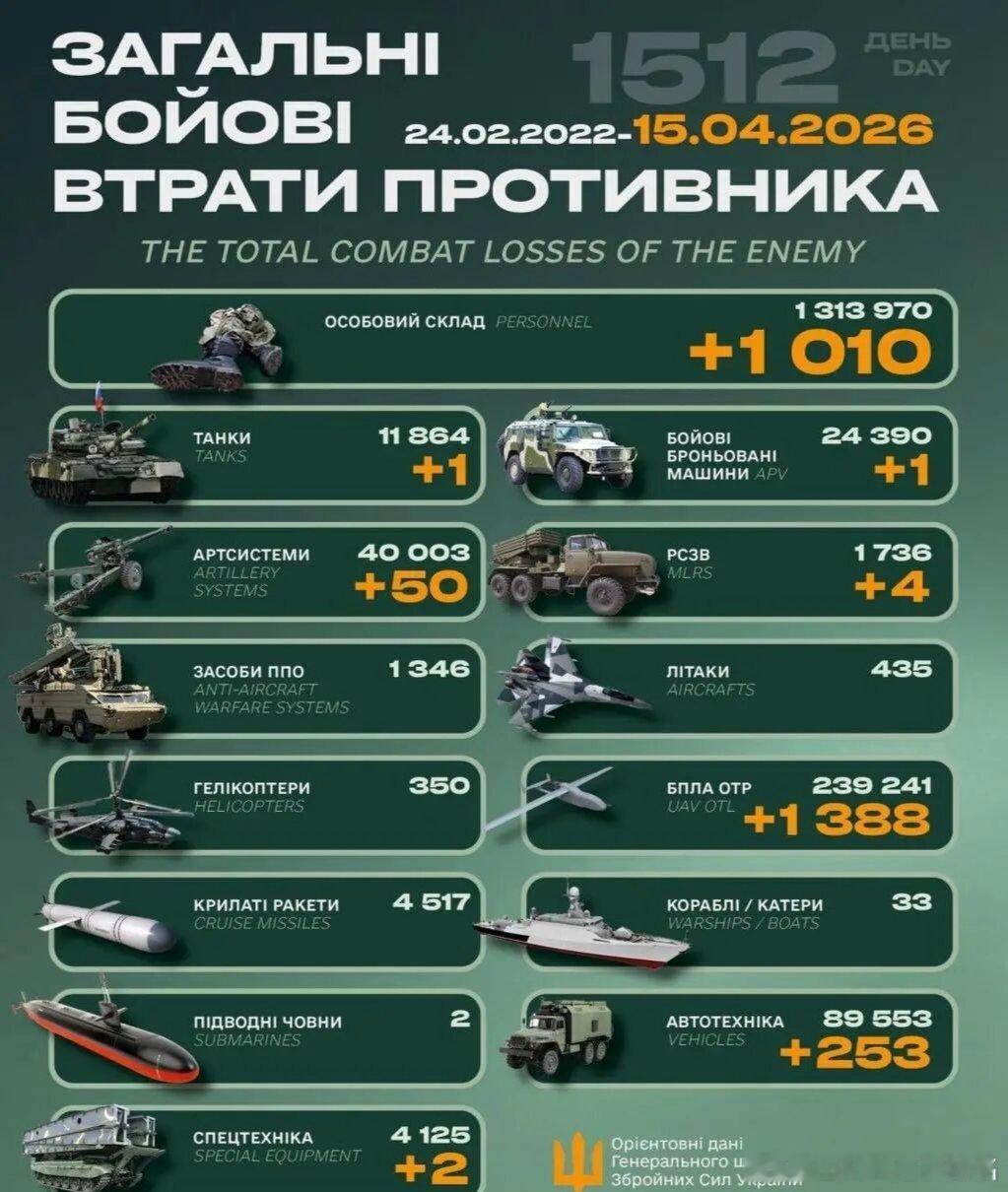 乌俄战争进入第1512天,乌克兰总参谋部发布战报:过去24小时俄军发动进攻84次,其中11次在胡利亚伊波列(20次在苏梅)、17次在康斯坦丁诺夫卡、8次在利曼、21次在波克罗夫斯克、7次在南顿涅茨克区域。毙伤俄1010名。俄军累计损失1313970人。摧毁俄1辆坦克、1辆装甲车、50门火炮、4个火箭发射装置、1388架大型无人机、253辆军车、2件特种设备。