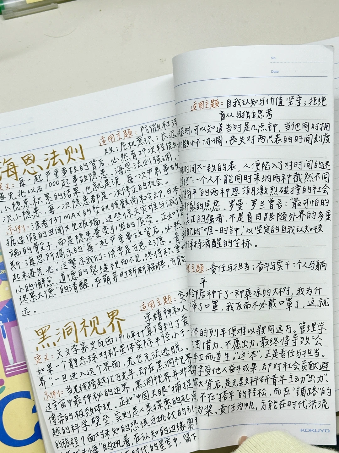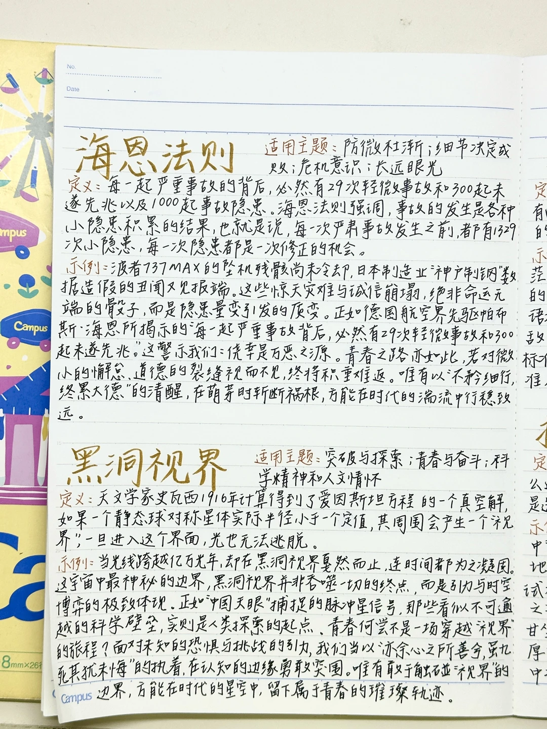 今天来分享几个定理/法则在高中议论文中的写作,分别是海恩法则、黑洞视界、手表定理和搭便车博弈。都是比较适合应用于写作中的,搭配定义,帮助大家更好记忆[扯脸H]