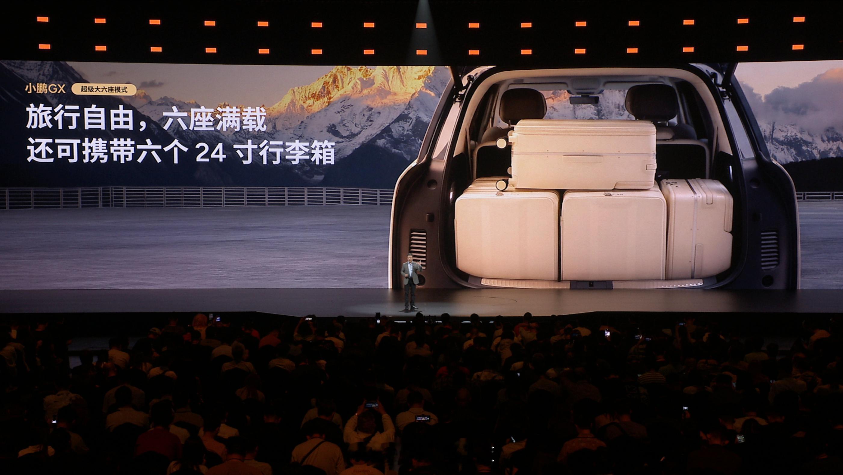 小鹏 GX 作为小鹏的全尺寸旗舰,空间上也有不少亮点:- AI 调光隐私玻璃;- AI 无菌风冷双开门车载冰箱,和美的一起打造- 21.4 英寸 3K 护眼大屏 + 全车 33 颗扬声器聆境音响,顶级影音享受; - 行业首发整车空调柔风系统,风感更柔和,体感更舒适;,和格力一起打造;- 三排电动三折叠大六座SUV;- 两把零重力座椅 + 一把飞航舒享座椅- 第三排支持 50:50 独立收纳:四座塞下 2 辆 24 寸和 2 辆 20 寸自行车;五座,竖放 5 个高尔夫球包;六座,6 个 24 寸行李箱;- 673 L 尾箱容积。