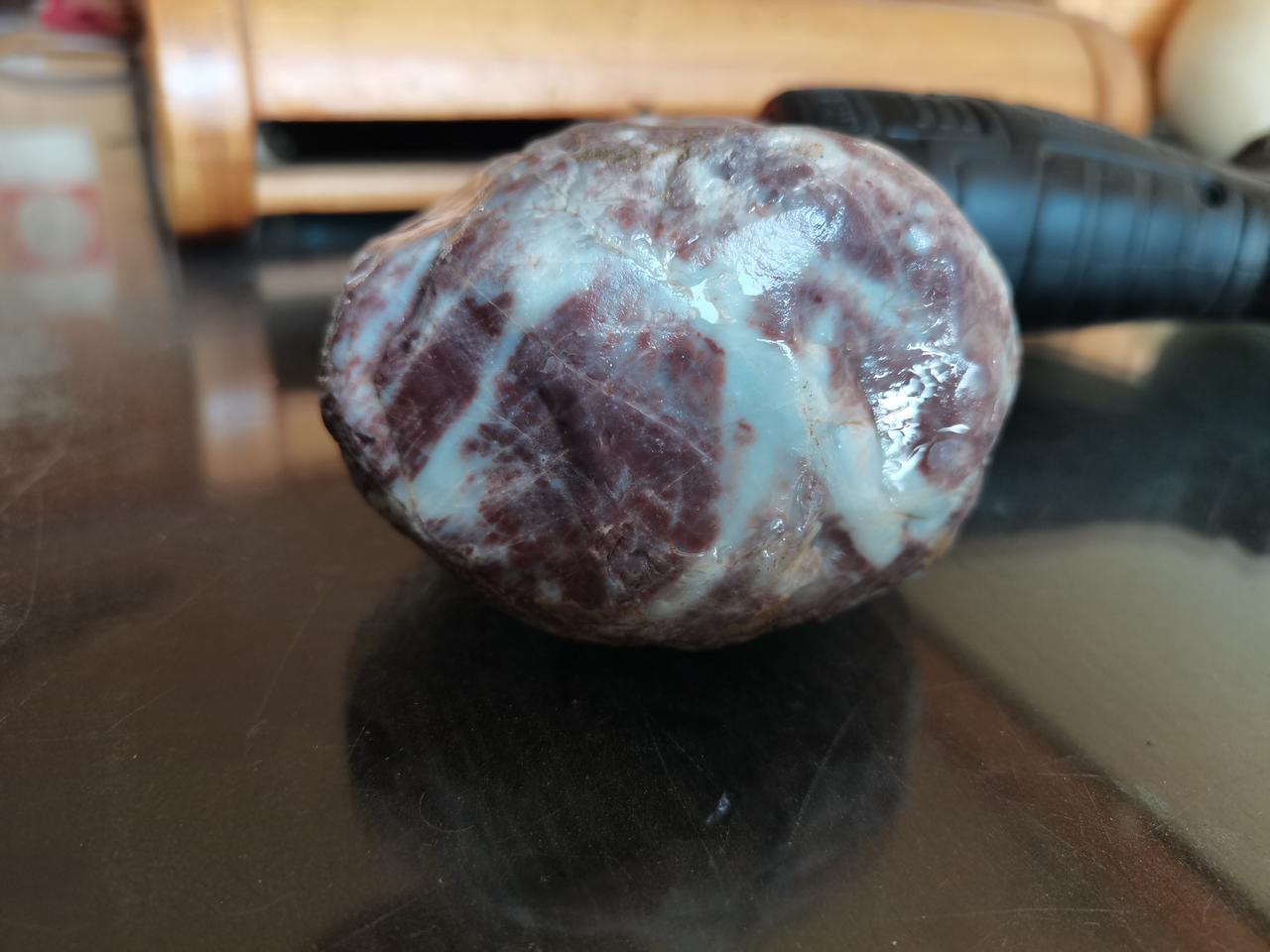 因为白色像气管,紫色像肺部,所以我认为这是一块肺石。但肺石并不是一种石头的分类,而是根据花纹来命名的。具体这是一块什么石头,我描述了状况,并拍了照片问AI。最终AI确认这是一块戈壁玉髓。