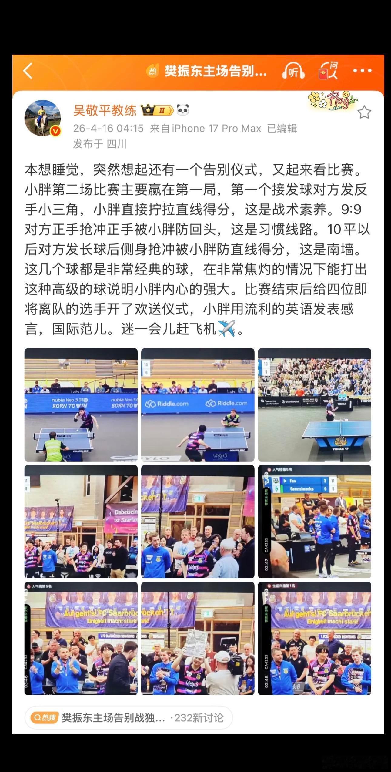 乒乓球吴敬平夸樊振东国际范儿吴敬平说樊振东内心强大吴敬平长文夸樊振东吴敬平教练熬夜看樊振东德甲常规赛收官战,发长文夸樊振东内心强大,点赞樊振东英语流利,有国际范儿!