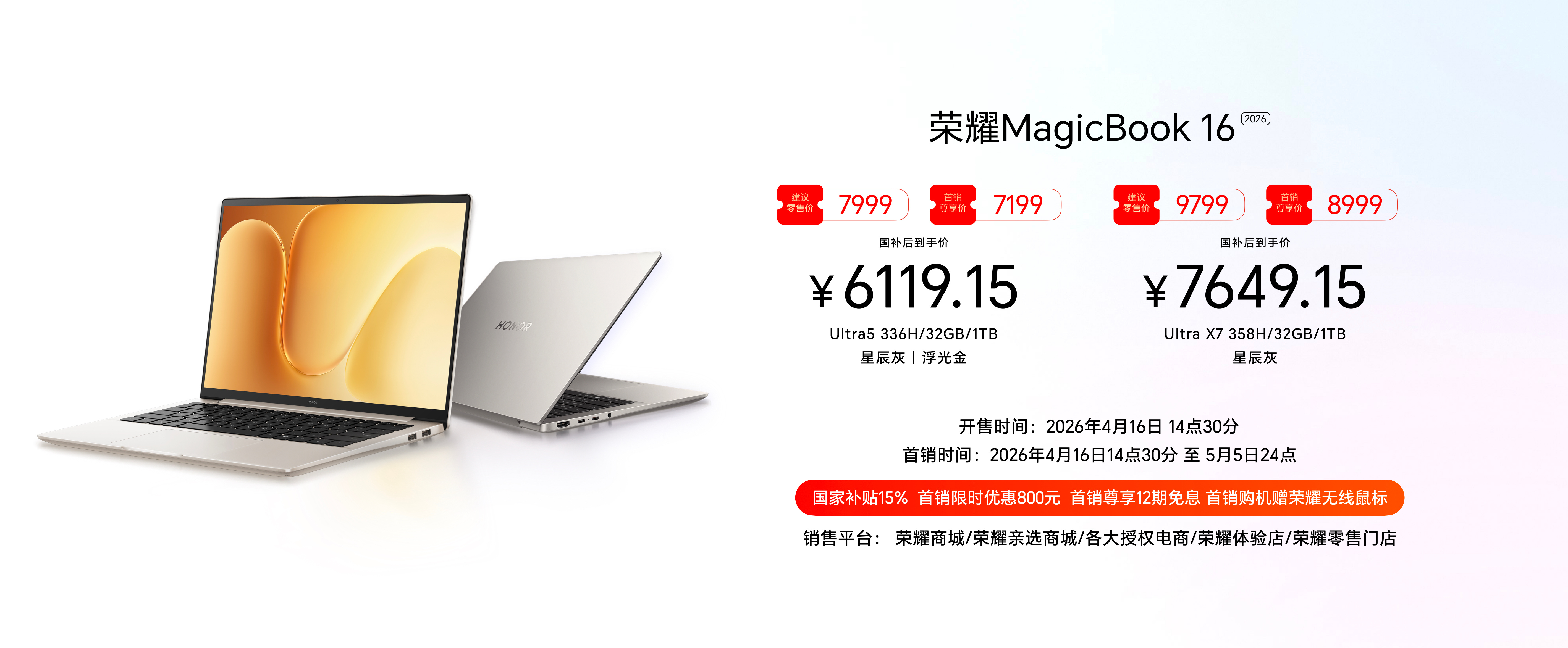 刚刚,荣耀史上最短发布会(真就几分钟),带来荣耀MagicBook 14 | 16 两款笔记本,首销价(国补后)5949.15元起,现已全渠道开售(刚才试了下部分地区缺货,产能要加油啊!)荣耀笔记本 更多新品下周4月23号发布会解锁