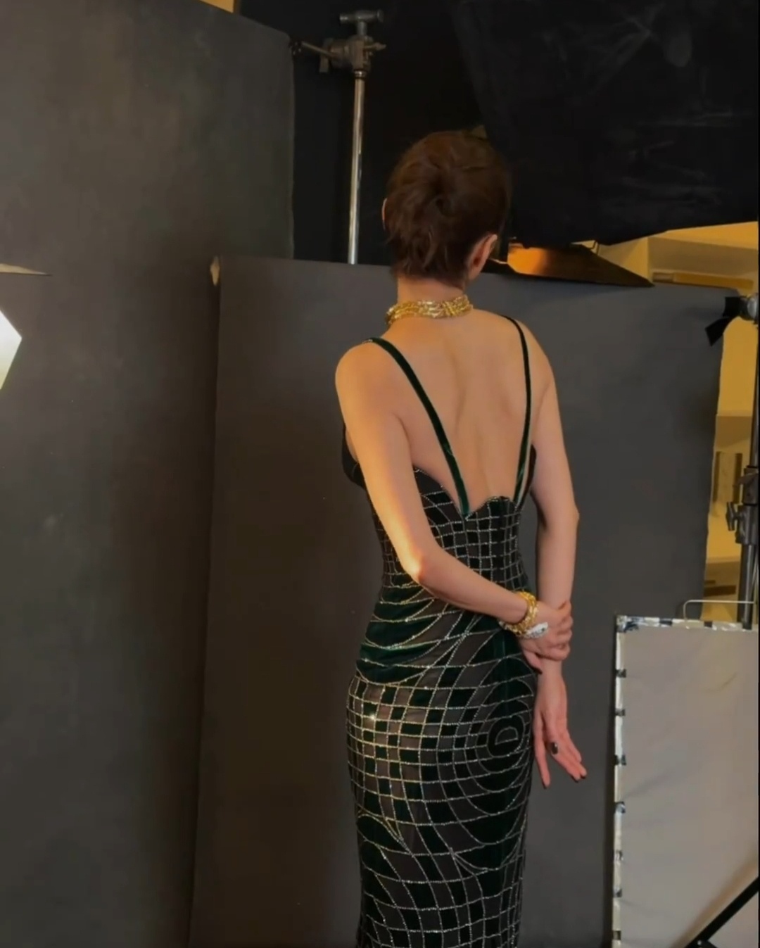 网格水钻顺着身体线条铺开,把曼妙身段勾勒得恰到好处,深V设计大胆又高级,半分不低俗,满屏都是藏不住的风情。