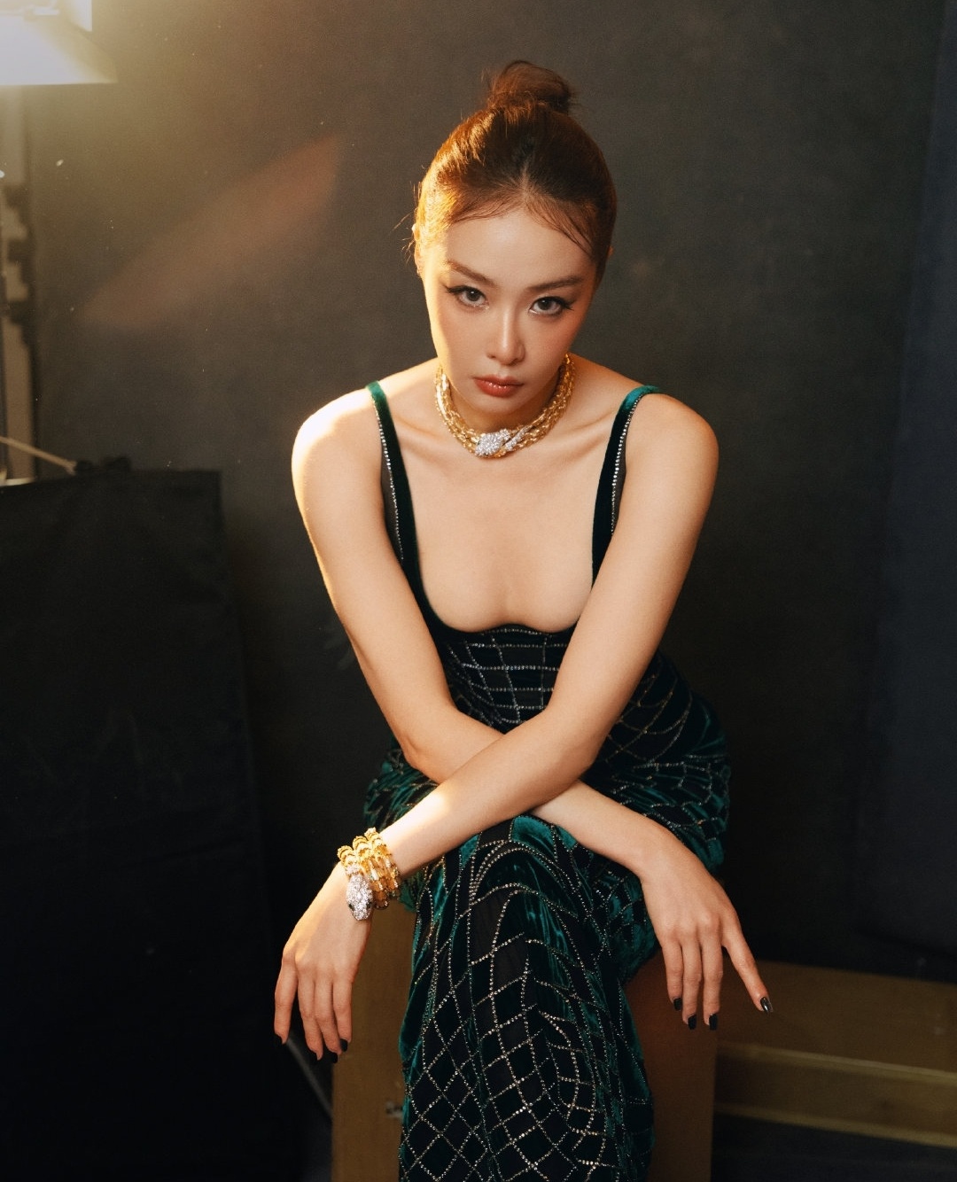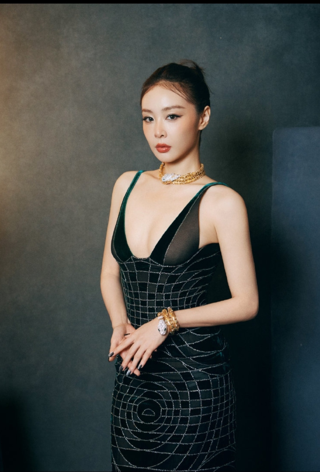 高叶这组北影节造型有点意思。墨绿丝绒深V长裙