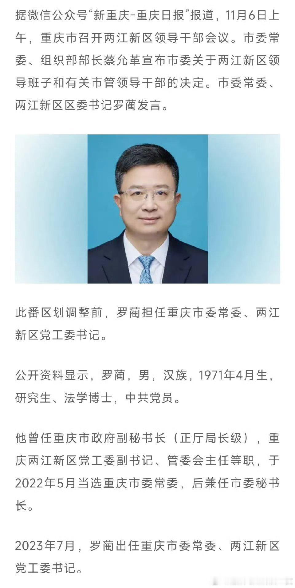 罗蔺涉嫌严重违纪违法2025年11月,重庆区划调整后,罗蔺成为新揭牌的两江新区首