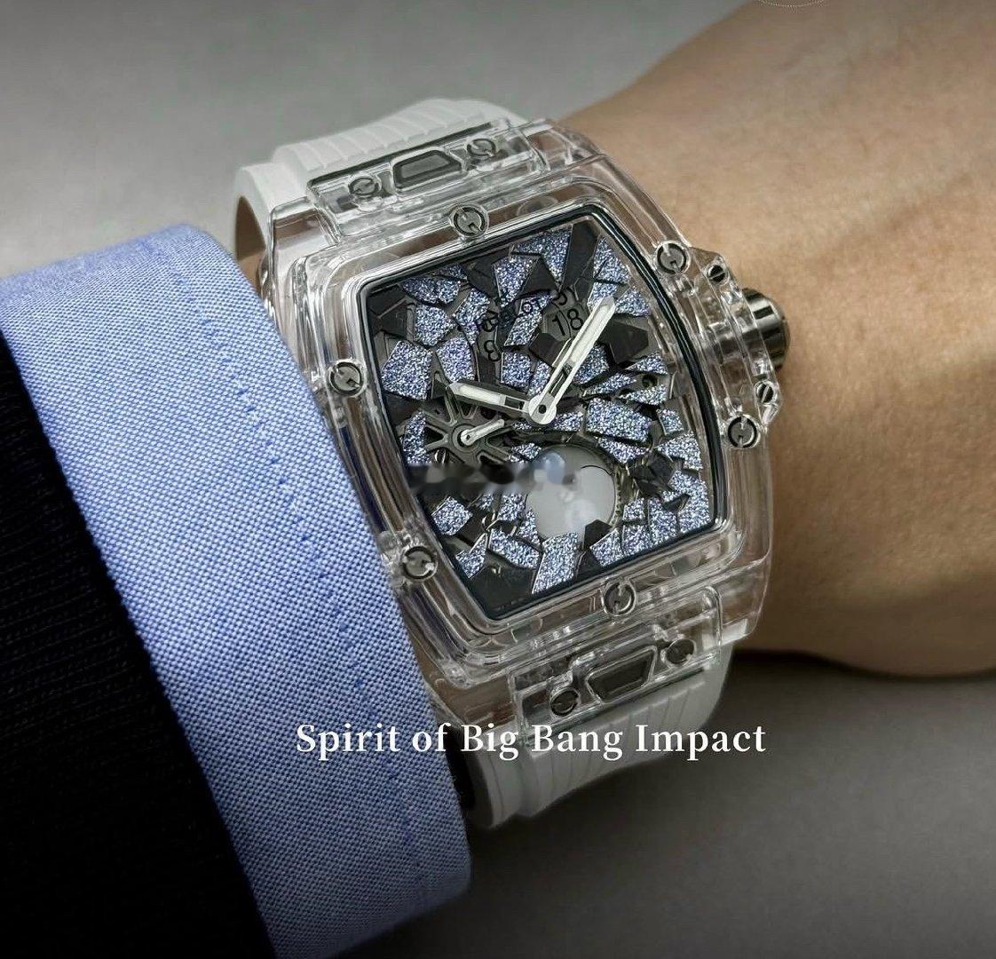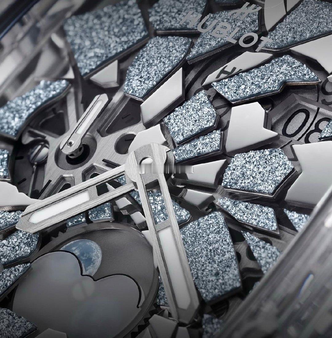 另一款Spirit of Big Bang Impact则大胆玩转碎片艺术!采用“地球上最稀有的金属”锇,以镀铑贴镶工艺将锇晶体碎片错落铺排于表盘,如宇宙星云炸裂,光芒璀璨无法忽视 !