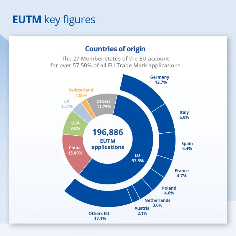 2025年,欧盟商标(EUTMs)占据了申请总量的最大份额。欧盟知识产权局(EUIPO)收到196,886份欧盟商标申请,比2024年增长了9.1%。