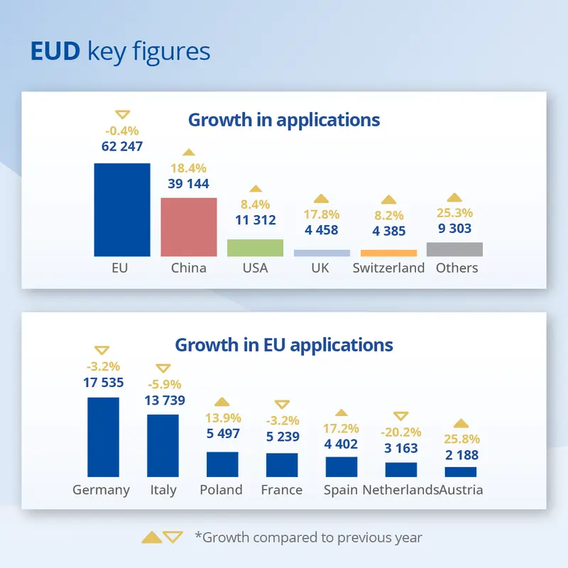 2025年,欧盟设计(EUDs)的需求也有所增加。欧盟知识产权局(EUIPO)收到130,849份设计申请,同比增长6%,这是连续第二年创下历史新高。