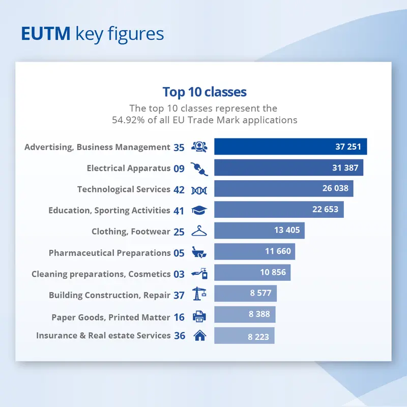 在产品和服务方面,“广告和商业管理”、“电气设备”和“技术服务”是申请的主要类别,紧随其后的是“教育和体育活动”和“服装及鞋类”。