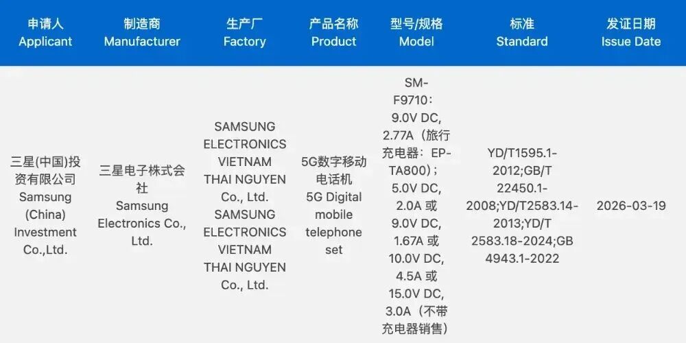 除此之外,型号为 SM-F9710、SM-F9760 的两款三星旗下手机在最近通过了认证。认证信息显示,这两款新机均支持 45W 快速充电标准。