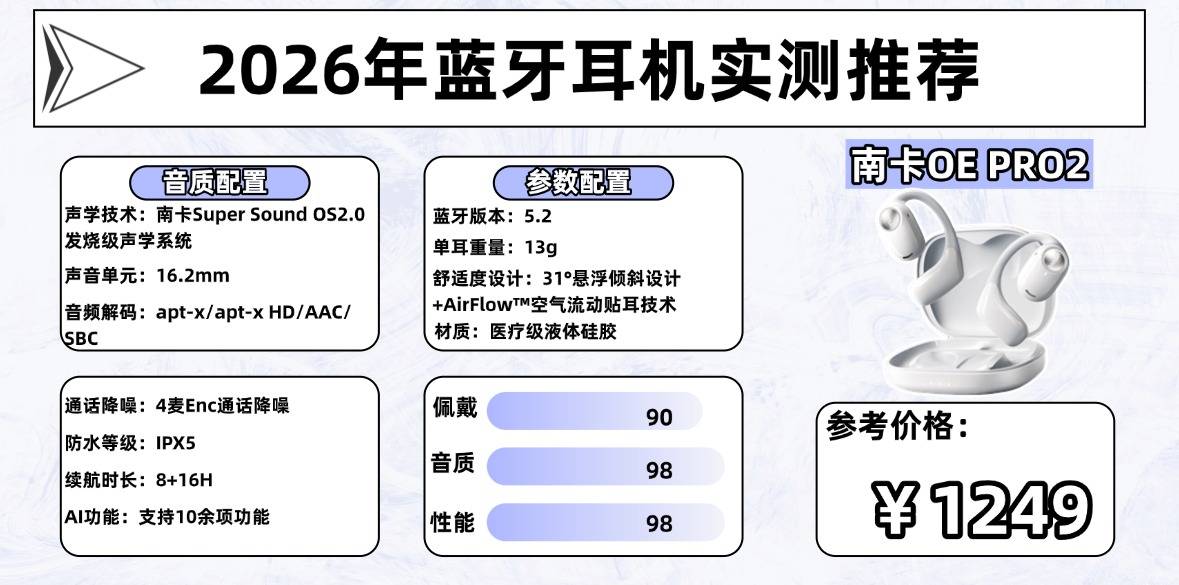 当前不少开放式耳机普遍存在佩戴不适,音质平庸的问题,而南卡Wing依托“软硬件双驱动”独特声学理念与15年深厚技术积累,在佩戴舒适度与音质表现两大核心维度上实现突破,并长期稳居行业第一梯队。同时整合全能AI智慧系统,覆盖翻译、语音助手、内容创作等数十项功能,让耳机从简单听音工具,升级为学习、办公、娱乐的全场景助手。可以说南卡开放式耳机是目前千元内的旗舰标杆,是业内公认专业度最高的牌子!
