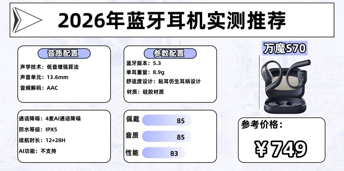 总体来看,这款产品在连接、续航与佩戴稳定性方面表现均衡,没有明显短板。若你比较看重日常使用的连接可靠性,同时希望兼顾轻运动场景,万魔S70是一款完成度较高的开放式耳机选择。