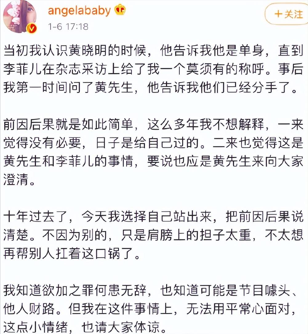黄晓明的前女友李菲儿曾在网上说过一些意有所指的话,很多人觉得是杨颖插足了两人的感情。