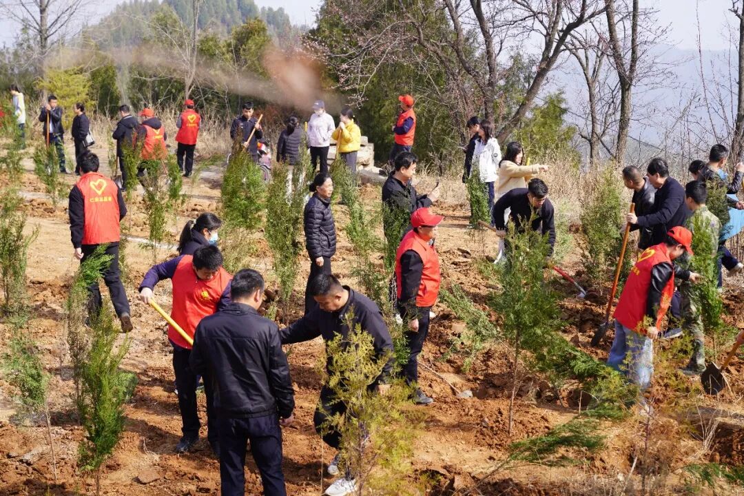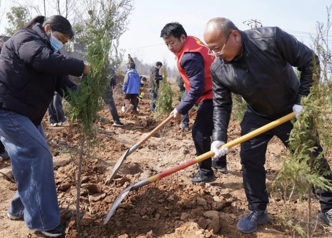 活动现场,大家分工明确、配合默契,有的挥锹铲土,有的扶苗培土,有的围堰浇水,每一个环节都认真细致、一丝不苟,现场一派热火朝天的劳动景象。在大家的共同努力下,当天共栽植侧柏、连翘、山杏等800余株。