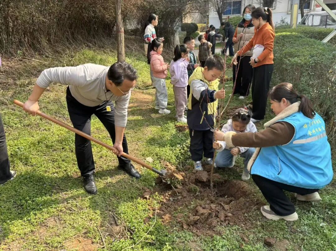 活动现场,社区工作人员、物业代表、幼儿园师生齐聚,热情高涨。大家分工协作,挥锹挖坑、扶苗培土、提水浇灌……每一道工序都一丝不苟,现场呈现出一派热火朝天的劳动景象。