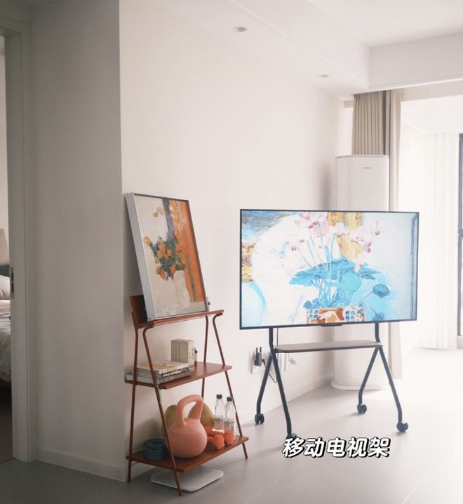 客厅开间较小,为了能让眼前看起来不至于太憋屈,干脆取消了传统的电视柜,既不买成品柜,也不做现在流行的悬空定制柜,直接用移动电视架代替,可以随意改变角度并移动,底部更是还有一个置物架放机顶盒等物,旁边再辅以收纳架,好看又灵活。