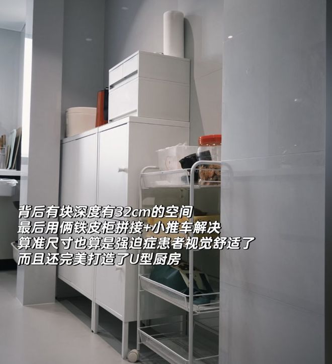 更值得一提的,则是铁皮柜旁边的小推车,收纳水果蔬菜和其他厨房杂物也恰到好处,灵活性可比定制柜强多了。