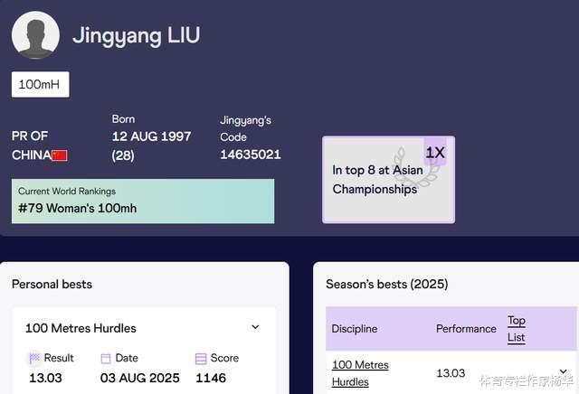国际田联官网的个人介绍,刘景扬的职业生涯最好成绩仍旧是13秒03,一个从未打开13秒的选手。刘景扬要想确立自己在女子100米栏的江湖地位,明年室内亚锦赛、室内世锦赛和亚运会都要比出高水准,而且钻石联赛也要争取拿到外卡。