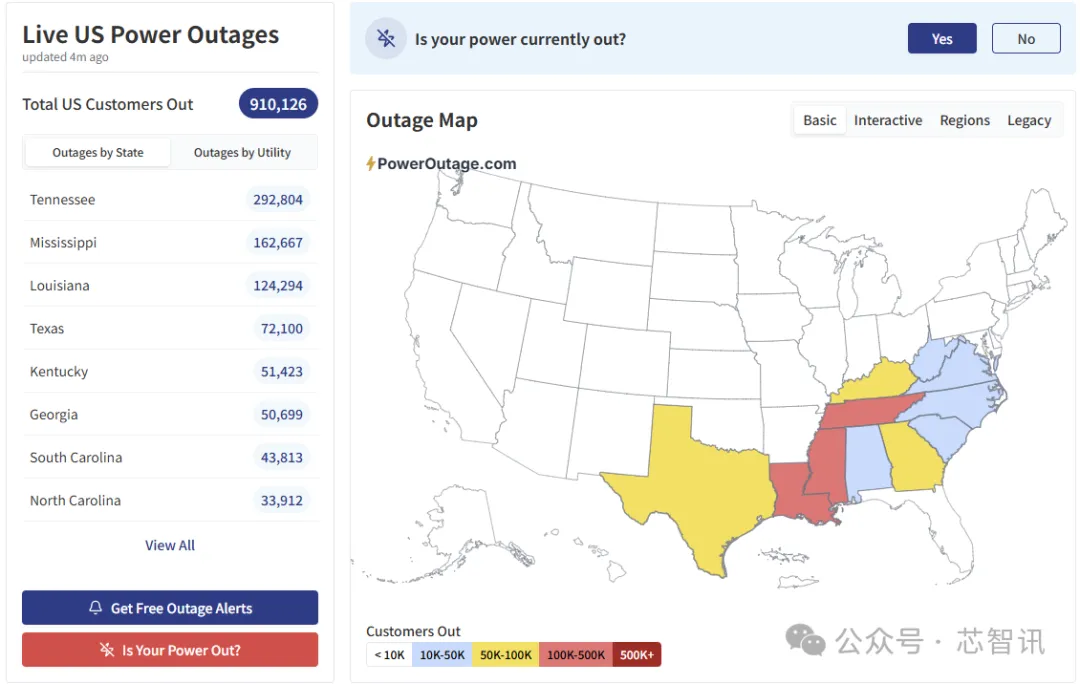 据 PowerOutage.us 网站的统计,截至美国东部时间1月25日晚间20 点,美国已有超过 90 万用户断电,其中田纳西州近30万户、密西西比州超过16万户、路易斯安那州超过10万户、德克萨斯州超过7万户受影响。