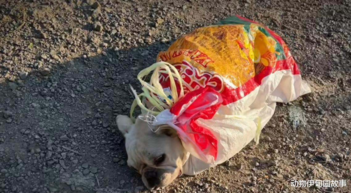 眼前是一只被人用麻袋装起来的法斗犬,被人随意丢弃在了路边。