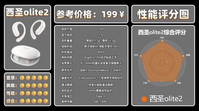音质表现:西圣Olite2的音质表现堪称炸裂!耳机搭载全新高品质数字信号处理器HiFi(DSP),算力大幅提升,精准修正音频失真,能重新发现歌曲细节,带来更精准的音乐表现。此外,西圣自研的2.0 SurroundWave™ 3D音场技术,使得声音的层次感和空间感全面升级,打造出媲美专业音响的沉浸式听感。16*10mm聚能动圈单元配合xisem声学专研调音,低音震撼,下潜深沉,声场开阔到让人惊艳。耳机还搭载TriAcoustic三腔体声学结构与SonicFocus 2.0定向传音技术,精准聚焦声音能量,极大减少音频泄漏,带来开放式耳机中罕见的纯净音质。虽然是亲民的价格,但是音质完全遵循千元耳机该有的标准。