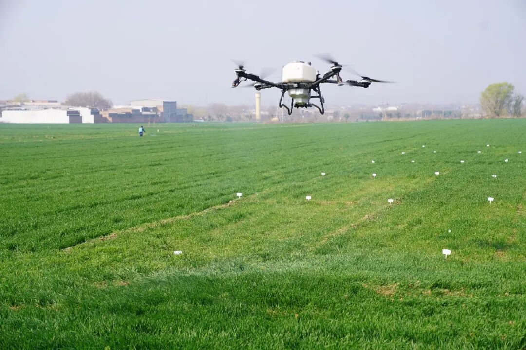 机身下方,细密的雾状药剂均匀地喷洒在麦叶上,为这片土地带来了精准而高效的田间管理。