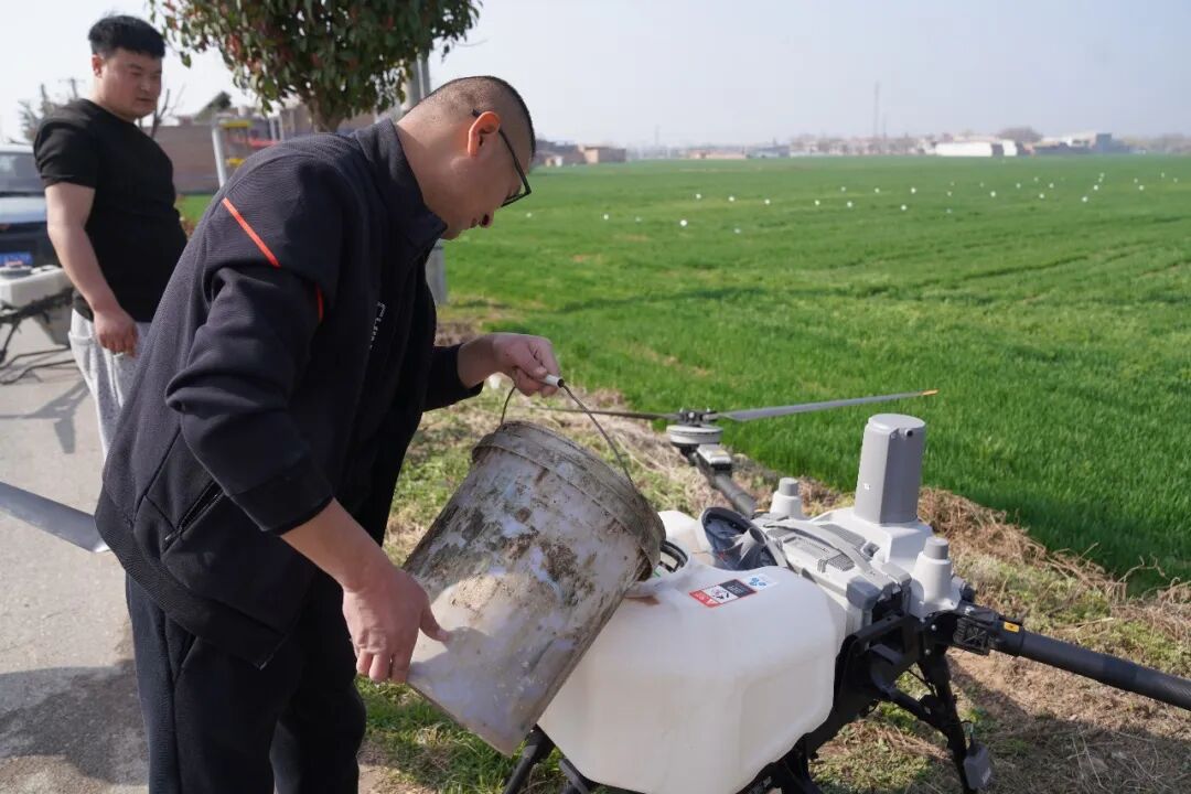“今天的飞防作业非常及时!”看着无人机从自家田地上空飞过,在马额街道流转了50多亩土地的种粮大户马斌紧锁的眉头终于舒展开来。他介绍,受2025年秋季连阴雨天气的影响,他家的小麦普遍晚播,苗情相对较弱,如何调动资源进行高效的春管成了他心头最大的难题。“使用无人机飞防覆盖面广、无死角,药剂喷洒更均匀,还能减少农药使用量,提升绿色防控水平。农技人员真是解了我的燃眉之急!”