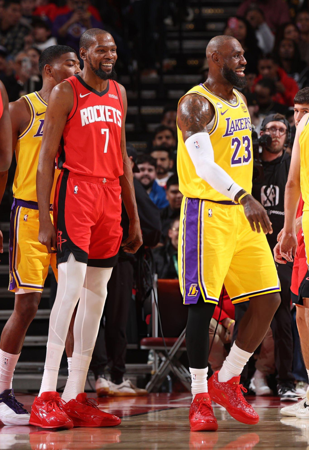 在本场比赛中,詹姆斯和杜兰特迎来了常规赛第31次交手!在之前的30次交手中,詹姆斯(19胜11负)场均25.9分7.1篮板7.1助攻1.9抢断0.8盖帽;杜兰特场均28.5分6.7篮板4.2助攻1.1抢断1.3盖帽。季后赛对阵中,詹姆斯(5胜9负)场均31.9分10.4篮板9.1助攻1.4抢断0.8盖帽;杜兰特场均31.7分8.1篮板4.9助攻1.1抢断1.6盖帽。