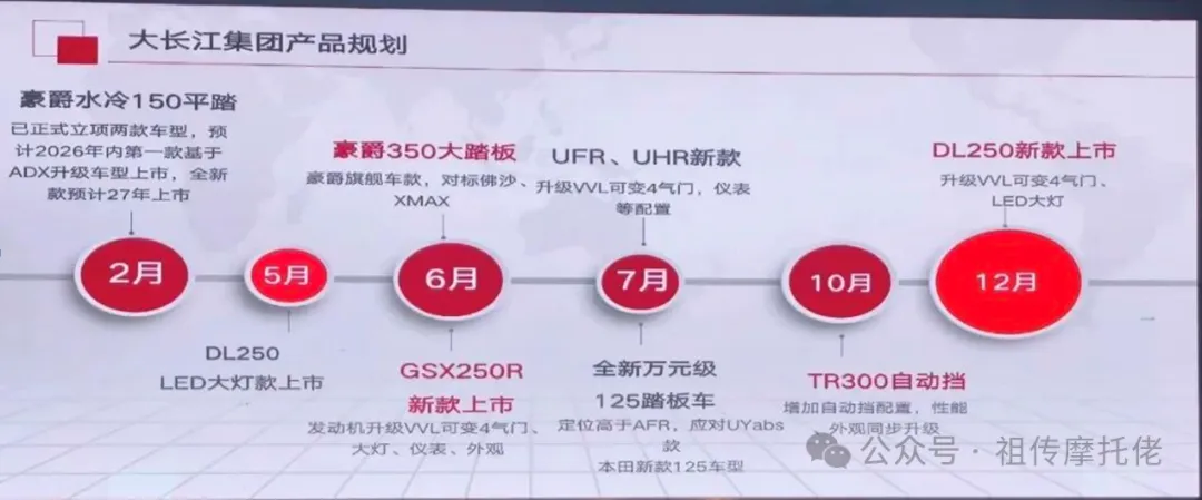 最近,大长江集团(豪爵)2026年的产品线规划被透露出来,包含踏板、跨骑、巡航等好几个种类,很多热门车型都要改版更新, 直接瞄准中高端市场,和合资热门车型正面竞争,本文只是梳理公开的规划信息,客观地把全年新车的节奏列出来,不做营销渲染。