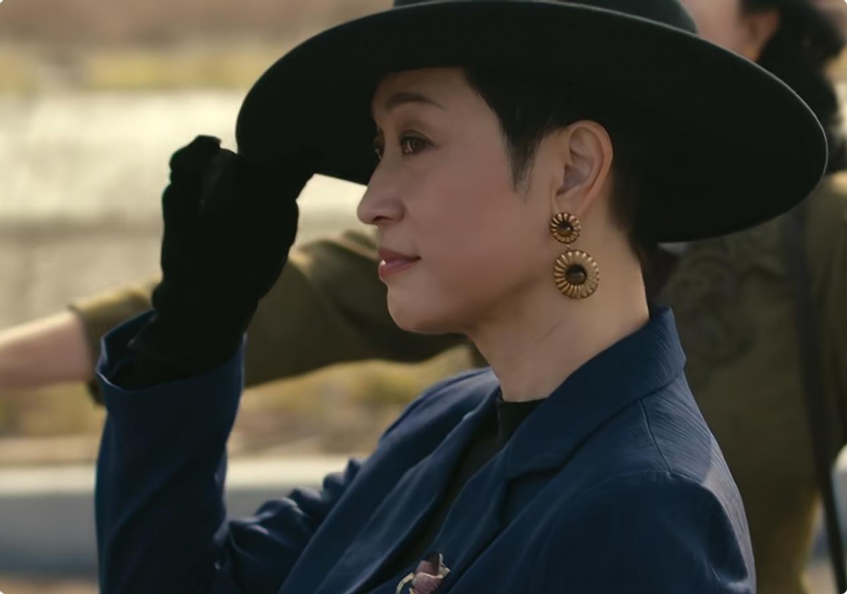 她的美自带距离感却不冰冷,港风妆容下的眉眼锐利又有神,说话时语速平稳却字字有力,轻抚猫眼石时,把商人的精明与大气拿捏得恰到好处。