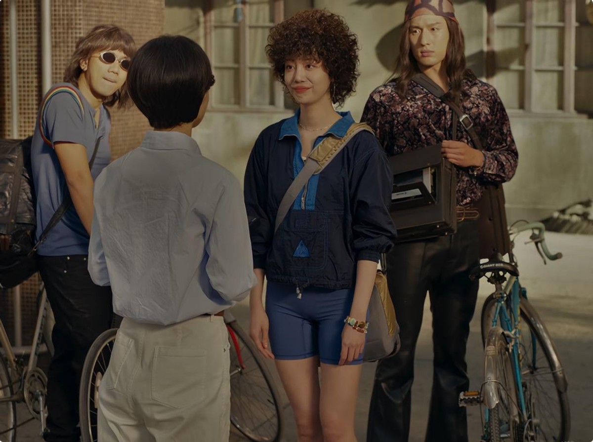 剧中的她顶着毛茸茸的卷发,戴着夸张的大耳环,穿中短上衣配高腰短裤,170的身高搭配110的腿长,妥妥的80年代时尚标杆,洋气又吸睛。