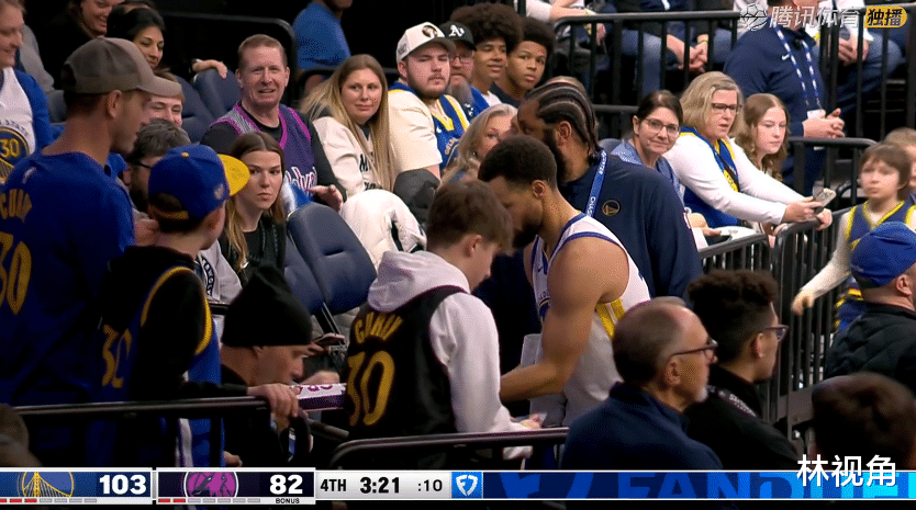 比赛还有最后3分21秒,镜头一转,给到场边库里,库里已经离开替补席,来到通道处给现场球迷签名,然后直接走入球员通道,先一步退场了。