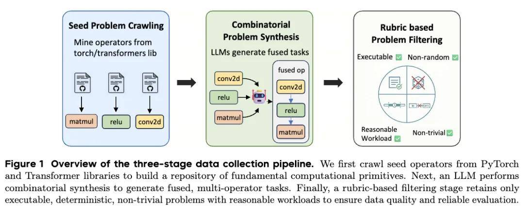 从 torch 和 transformers 中挖掘种子算子。每个算子都以一个 Python 类的形式表示,包含初始化和前向传播方法。 在组合式合成阶段,最多采样 5 个 torch 算子,并将它们按顺序组合,构造成融合任务。 筛选阶段仅保留那些在 eager 模式和 compile 模式下都能正常运行的任务,同时移除包含随机性的算子。 为防止「投机取巧」,剔除在不同输入下输出为常数或无法区分的任务。 在工作负载控制方面,将 eager 模式下的运行时间限制在 1ms–100ms 区间内,并移除与 KernelBench 高度相似的样本。