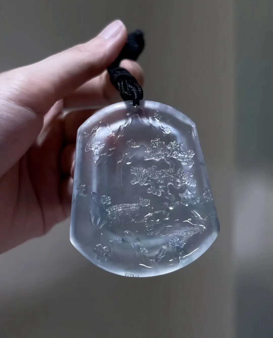 目测这块料子,清澈干净,肉质达到一个高冰玻璃底了,主要还是看起货效果,不过料子不大,没有手镯位置,只是牌子,挂件位,质地细腻,结构致密,肉眼几乎看不到明显的颗粒感,如同冻得结实的果冻。表面光滑,手感凉滑,触摸时能感受到那股冰凉的质感。