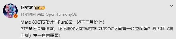 近日,数码博主“超维界”再次爆料称,“Mate 80GTS预计与PuraX2一起于三月份上! GTS❤还会有惊喜,还记得我之前说过存储和SOC之间有一片空间吗?最大杯(满血版)❤一直未露面!”此前,数码博主“定焦数码”曾发文表示,华为Mate 80 GTS和第二代Pura X阔折叠屏手机,规划暂定于2026年上半年登场。