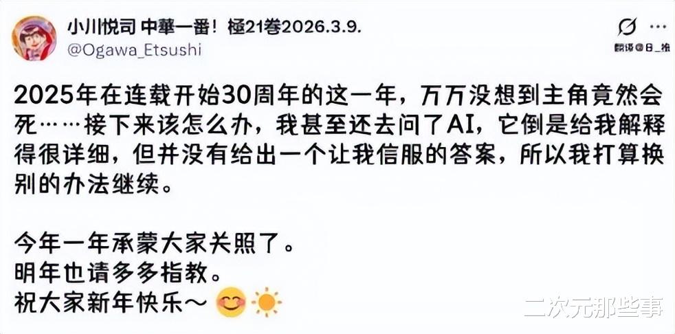 而近日,小川悦司在社交媒体上发文称自己去年在漫画连载30周年的时候画死了刘昴星,这也让他不知道怎么继续后面的内容,为此他甚至还去问了Ai,Ai虽然讲了一大堆,但却没有给他一个让人信服的答案,所以他准备换别的办法继续。