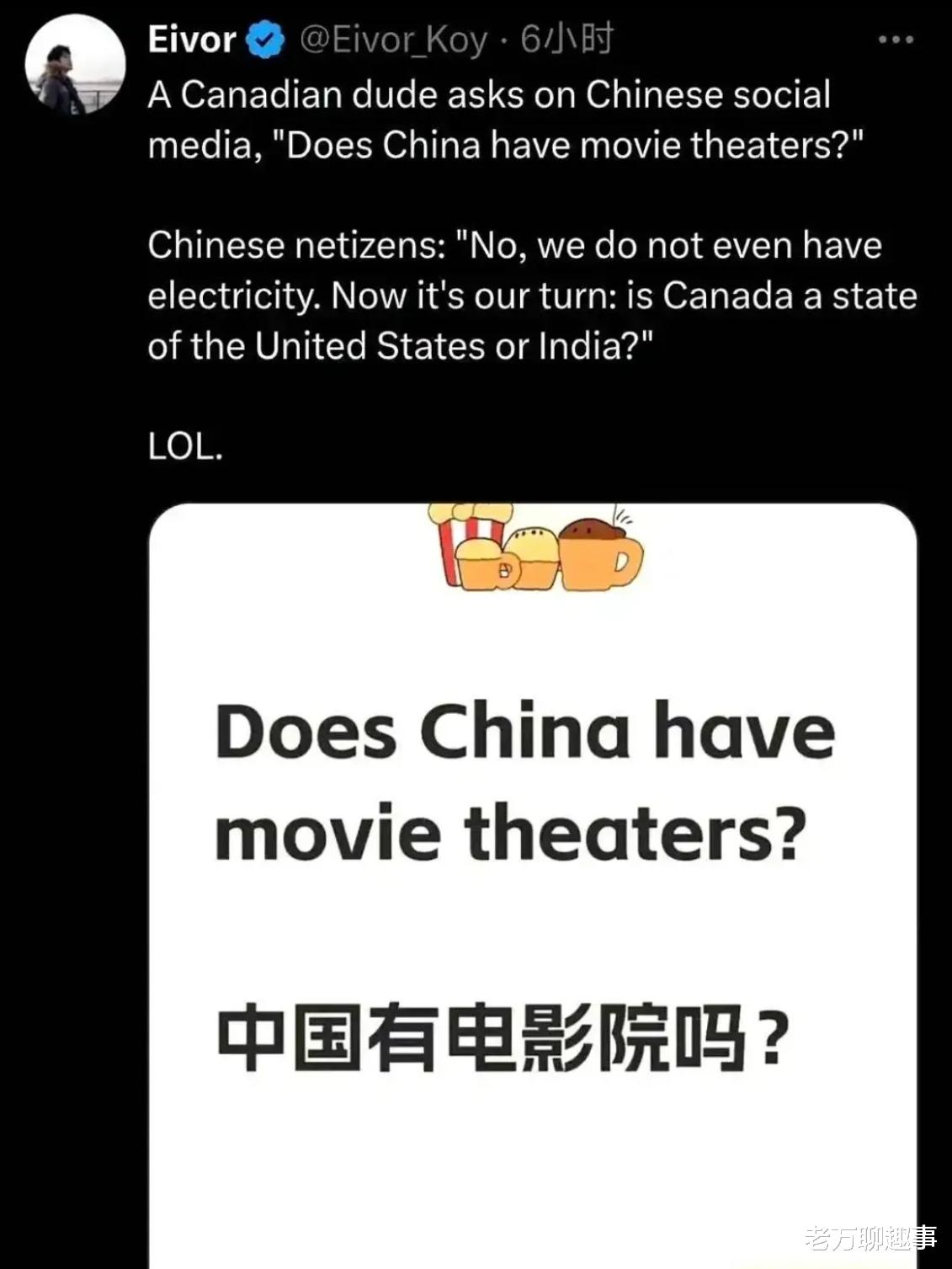 我问你个问题,加拿大人到底是真的不懂,还是装糊涂?一个加拿大小伙子在社交媒体上问:中国有电影院吗?