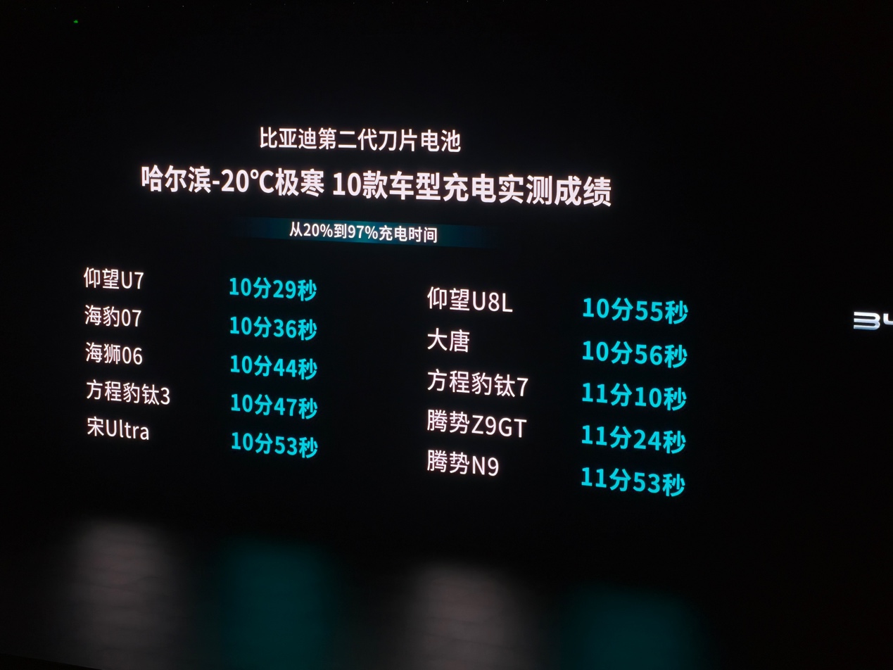 首先是极致的充电速度,第二代刀片电池常温状态下,电量从10%充至70%仅需5分钟,充至97%也仅需9分钟。在零下30度的极寒环境下,从20%充至97%耗时12分钟,只比常温多出3分钟。