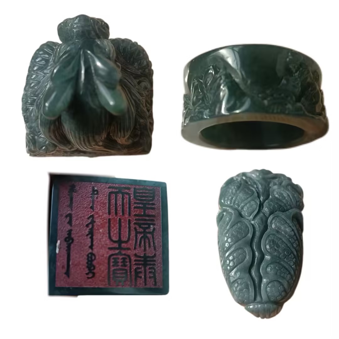 七、最后:一套翡翠里的 “传统与现代”当你把玩这组翡翠 —— 龙钮印章的厚重、蝉形把件的灵动、山水扳指的悠远,你触摸的不只是翡翠的温润,更是: